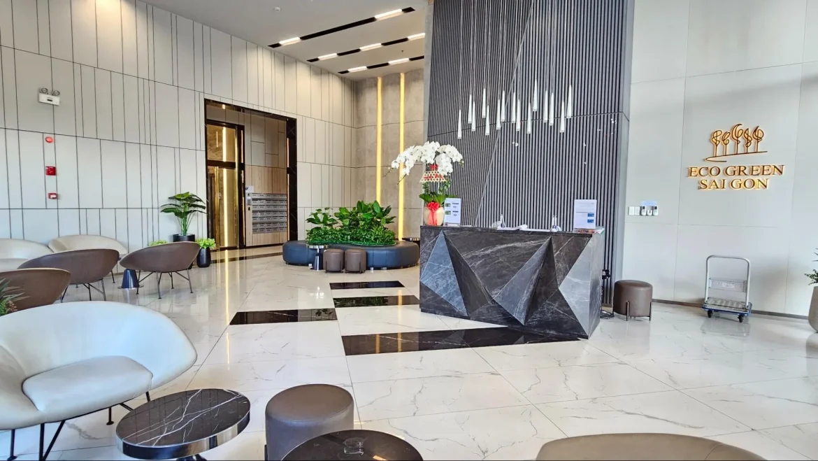 Sảnh lễ tân và hành lang tòa nhà, nơi thể hiện chất lượng dịch vụ tương xứng với phí quản lý Eco Green Sài Gòn